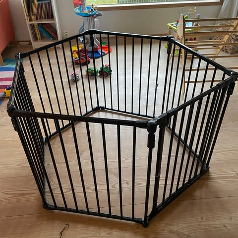 BabyDan Flex sikkerhetsgrind i hvit metallutførelse. Grindens høyde er ca. 70,5 cm, og den kan justeres i bredden fra ca. 90 til 278 cm ved hjelp av de medfølgende seksjonene. Egnet som beskyttelsesgrind foran peis, ved trapper eller for å avgrense områder innendørs der barn ikke skal ha tilgang. Laget i Danmark.