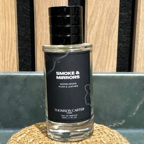 Thomson Carter Postcards From Cedar, Saffron & Amber parfyme. Duft med noter av sedertre, safran og amber. Leveres i flaske med sort kork og etikett i mørk farge. Passer som hverdagsduft eller til bruk ved spesielle anledninger, for personer som liker varme og krydrede duftkomposisjoner.