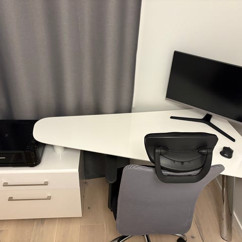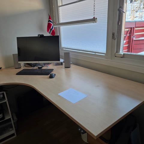 IKEA skrivebord i hjørneløsning. Bordplaten er i mørk utførelse med avrundede kanter, og bordet står på metallben. Løsningen gir god arbeidsflate langs to vegger og egner seg til hjemmekontor, studieplass eller generell kontorbruk. Det er plass til skjerm, skriver og annet kontorutstyr på bordplaten.