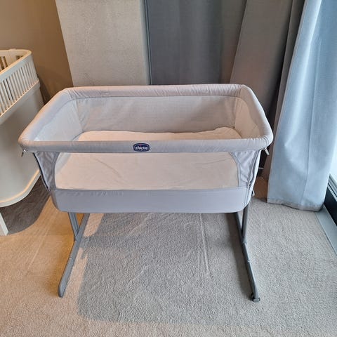 Selger Chicco bedside crib babyseng i grå tekstil. Sengen har justerbar høyde med flere nivåer og kan tilpasses voksenseng ved siden av. Meshfelt på sidene gir innsyn og lufting. Stabil ramme med ben som kan skyves delvis inn under voksenseng for nær plassering. Egnet som babyseng ved siden av foreldreseng de første månedene.