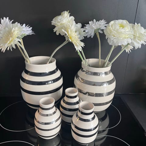 Dette er en Kähler Omaggio vase, ca 21 cm høy, med blå/grå og hvite striper.