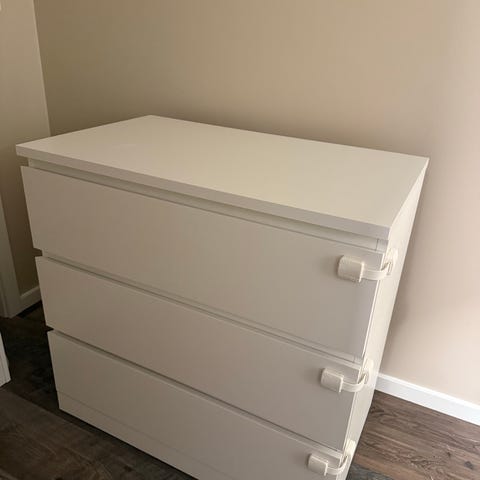 Hvit stellekommode kjøpt ny på babyutstyrsbutikk for noen år siden. Brukt som stellebord, men stelleputa har revna så den er kasta.