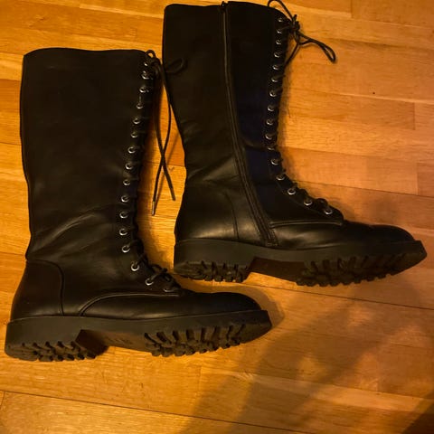 Svarte Timberland støvler i størrelse 40. Ble kjøpt for et par år tilbake og ble liggende i skapet fordi de er en halv størrelse for små. Brukt maks 2 ganger i fint vær om våren. Nå tar jeg en opprydding og selger det som ikke passer helt perfekt. Fine sko som jeg håper finner en ny eier som vil ha glede av de.