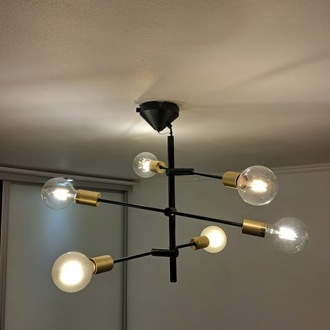 Selger en sputnik taklampe med 6 lys i svart. Kjøpt ny i 2020. Lampen er i god stand og gir et fint lys. Pærer følger med, men én av pærene må byttes.