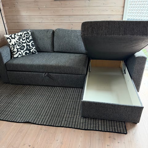 Sovesofa med oppbevaringsrom for overmadrass/dyner/puter. Synlig brukt, og bunnen i oppbevaringsrommene er skadet, men holder fint på overmadrassen. Overmadrass følger med.