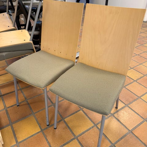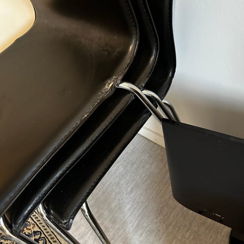 Tre fine stoler. Trenger oppusing / snekring så kan de bli veldig bra. Må hentes. Fargen er svart. Treramme hvor man lener er veldig fint og bra. Ben er ustabile må festes bedre. Material hvor man sitter er ny og fin, men puter under virker ujevnt.