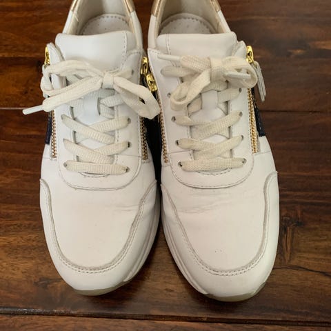 Hvite Gabor Comfort sneakers I hvit skinn selges grunnen de ikke passer mine føtter som trenger spesialsko. Brukt 1 gang og ligget i esken siden. Fine, myke og veldig behagelige sko til hverdagen. Gode å gå i lange distanser også. Nypris kr. 1100,-