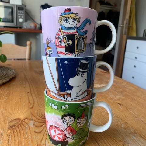 Arabia Mummi krus med minikopp i blått motiv. Kruset har illustrasjoner av Mummihuset i blå bakgrunn med rødt tak og gule vinduer. Med følger en liten kopp i samme serie med Mummi-motiv. Settet passer til servering av varme og kalde drikker og som samleobjekt for Mummi-serien fra Arabia. Mimmi kort . Hentes på Hovseter eller sendes mot at kjøper betaler porto