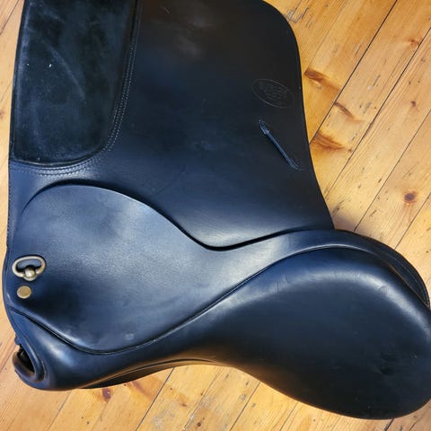 Salen ligger godt på de fleste hestene jeg har brukt den på, alt fra kort og stutt rygg til rett og lang rygg. Den er i relativt god stand og læret har blitt renset og pusset jevnlig.