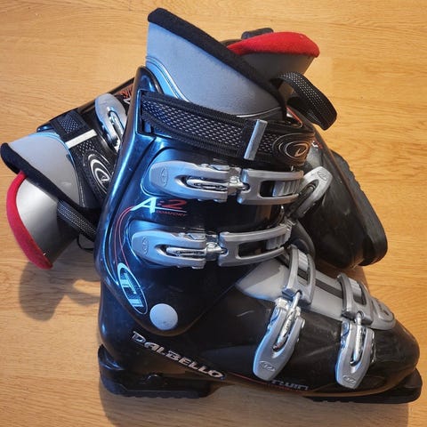Dalbello CX R2 alpinstøvler i størrelse 21.5 (250 mm sålelengde). Støvlene har to justerbare spenner foran for god tilpasning rundt fot og legg. Ytterskall i grå plast med røde detaljer og polstret, svart innerdel for økt komfort. Passer til vanlige alpinbindinger og er egnet for barn med tilsvarende skostørrelse som 21.5 mondopoint. Sirka EU33