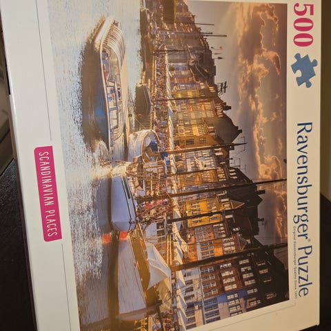Ravensburger puslespill med 1500 brikker. Motiv av bymiljø med broer og bygninger i flere farger. Ferdig puslet størrelse er ca. 80 x 60 cm.