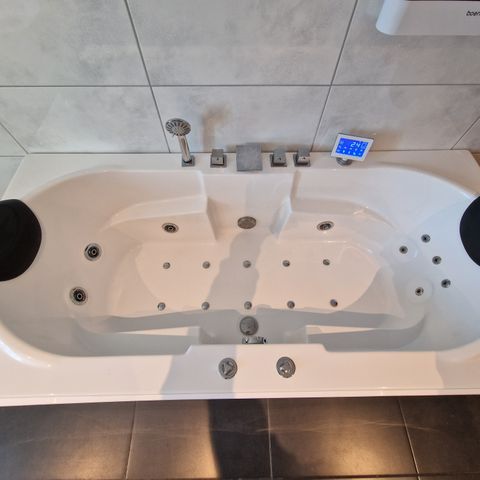 Strømberg Padua back to wall badekar i hvit utførelse. Rektangulær modell med rette linjer og integrert overløp. Badekaret har glatt innside og utside i hvit overflate, og er beregnet for plassering midt på veggen På bildene vises også armatur og hånddusj i sort, montert på karkanten. Egnet for bruk på bad der det er ønskelig med et badekar med moderne, rettlinjet design.