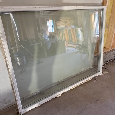 Fastkarm vindu i hvit ramme. Feil bestilt fra 2010. Størrelse, største høyde 76 cm (venstre side, sett fra utsiden), minste høyde 29 cm. Bredde 220 cm. Alle utvendig karm mål.