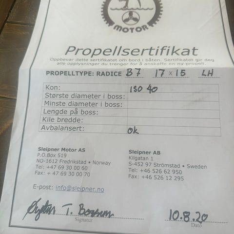 Nytt ubrukt Sleipner propellanlegg med 25mm aksling-2000 mm lengde. Utvendig stevnefeste med lager, hylserør 1000 mm lengde og 3 blads E13 propell diameter 16’’ stigning 10’’ høyre roterende. Selges meget gunstig. Nytt koster dette ca kr 19 800. Kan ordne frakt/ sending.