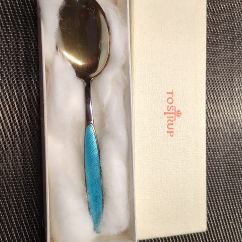 Dessertskje/isskje/barneskje. 14 cm. Tostrup skje med lyseblått emaljehåndtak. Skjeen har metallskål med gyllen overflate og dekorert skaft med lys blå emalje. Leveres i original eske merket Tostrup. Egner seg som bordbestikk eller til servering, og kan også brukes som samleobjekt.