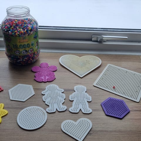 Pakke 9 perlebrett og 2 esker med store perler