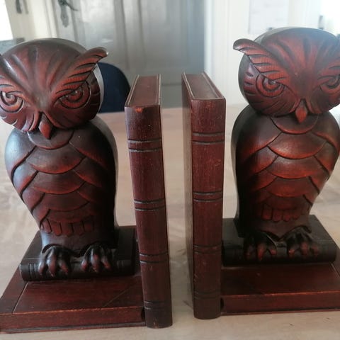 Bokstøtte i tre, utskåret i noe som minner om buksbom, nokså glatt og hardt treverk. Kjøpt antikk i Franrike. Makshøyde ca 17cm.