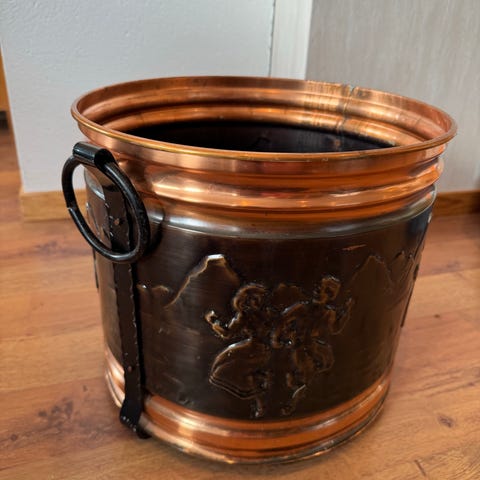 Stor rustikk kobberbalje på ben – perfekt som vedkurv eller plantekar