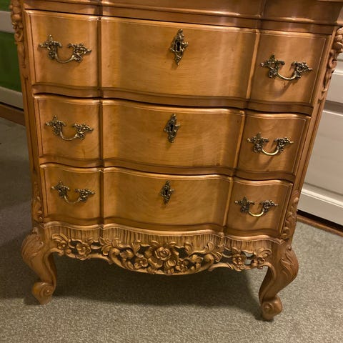 Den er dekorert med klassiske ringhåndtak i messing og detaljerte ornamenter på hjørnene og buen nederst. De høye, slanke bena gir møbelet et lett og luftig preg, til tross for god lagringsplass.
