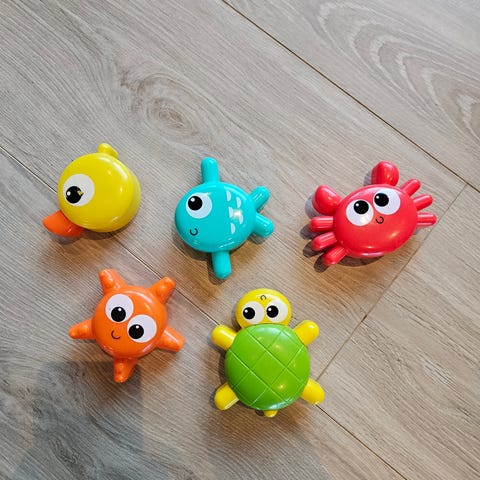 Badeleker og en holder me sugekopp til å oppbevare lekene