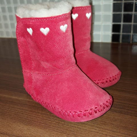 UGG babysko i størrelse 18 for jente. Skoene er rosa og har myk, lodden innside og kant rundt ankelen. Yttermaterialet ser ut som semsket tekstil med antiskli-detaljer under sålen. Passer som varme og myke innesko eller tøfler til baby.