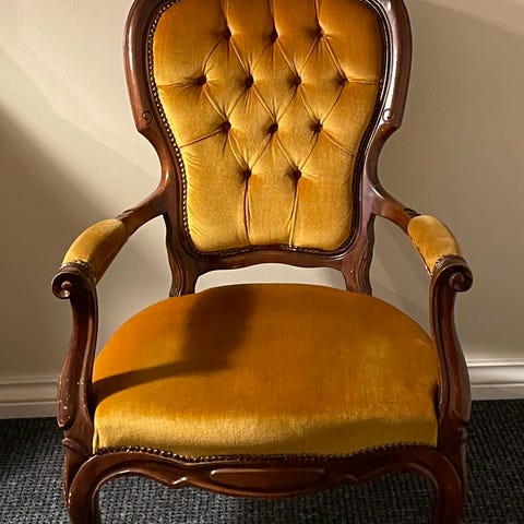 Selger en unik og herskapelig lenestol som garantert blir et blikkfang i rommet. Stolen er rik på detaljer, med massive, utskåret mønstre i treverket langs understellet og armlenene.