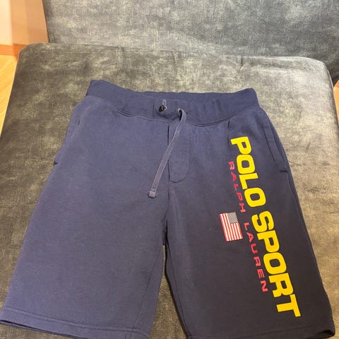 Ralph Lauren Polo denim for herre. Buksen er i blå denim med elastisk ribbekant i livet og nederst på bena, med gule og blåstriper. Størrelse M med livvidde W30. Materiale i denim med myk, ribbestrikket linning og mansjetter. Trykk på låret med «Polo RL Athl. Club 1967». Egnet som hverdags- og fritidsbukse.