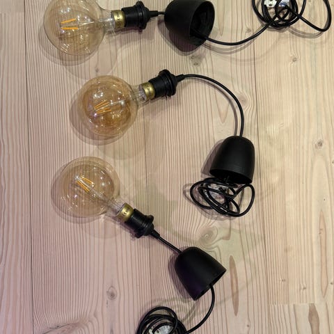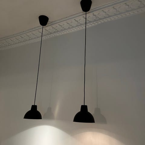 3 stk IKEA Nymåne pendellampe i svart selges billig. Diffusor oppover og nedover, og plass til 3 lyspærer gir veldig godt lys. Like god i entréen som på gutterommet. Diameter 40 cm. 100 kr per stk eller 3 stk for 250.