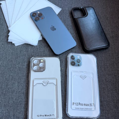Telefonen har stor skjerm med frontkamera i øvre kant og tredobbelt hovedkamera på baksiden med egen LiDAR-sensor. Modellen har flat kant rundt hele rammen og bakside i lys blåfarge . Lagringskapasiteten på 128 GB gir plass til apper, bilder, video og andre filer.