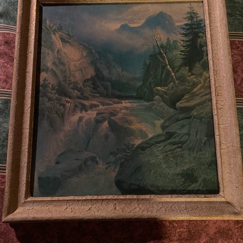 Antikk trykk/maleri fra ca 1900 av ung mor. 2 stk. ung mor som går opp trappen med lite barn. Og ung mor som står og ser på sitt sovende barn.