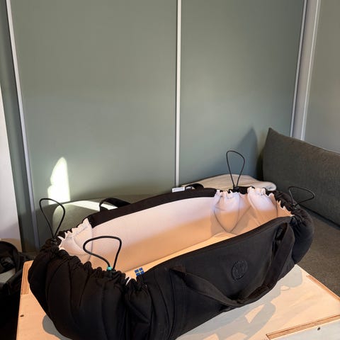 Selger en meget pent brukt Najell Sleepcarrier X i fargen Oat Beige, inkl. 2 stk vanntett madrassbeskytter, bunndeksel og reducer.