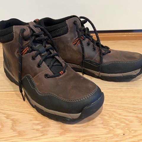 Clarks støvler i størrelse 43 for herre. Modellen er laget i svart skinn med kraftig yttersåle og snøring foran. Skoene har Gore-Tex-membran, som gir vannavvisende og pustende egenskaper. Passer som hverdagssko eller til bruk i våtere og kjøligere værforhold. Overdel i lær, tekstilfôr og solid gummisåle. Normal høyde over ankelen gir støtte ved gange.