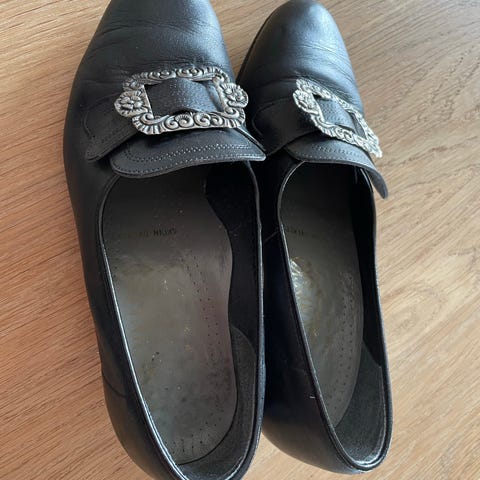 Selger et par klassiske pensko i sort skinn med dekorativ sølvfarget spenne. Skoene bærer preg av god, gammel kvalitet i materialene.