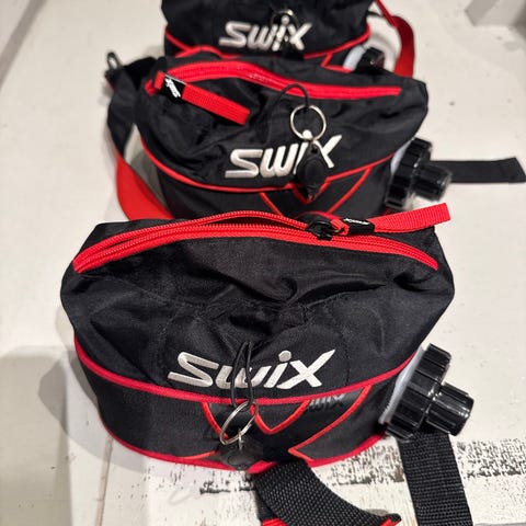 Swix drikkebelte i svart og rødt. Beltet har justerbar stropp og glidelåslomme på toppen for oppbevaring av småting. Integrert flaskeholder med skrukork på siden. Egnet til bruk på tur, langrenn og annen utendørs aktivitet der man ønsker enkel tilgang til drikke og små eiendeler.
