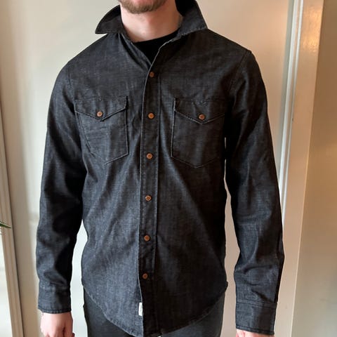 Pen og lite brukt skjorte i tykk denim selges.
