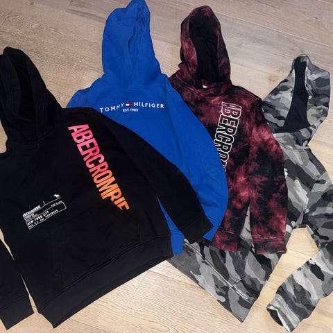 Abercrombie & Fitch hettegenser og Polo genser for gutt i størrelse 10-12 år. Hettegenseren er flerfarget med trykk på front og er egnet som hverdagsplagg. Flerfarget genser i rødt er i en større størrelse. Selges samlet.