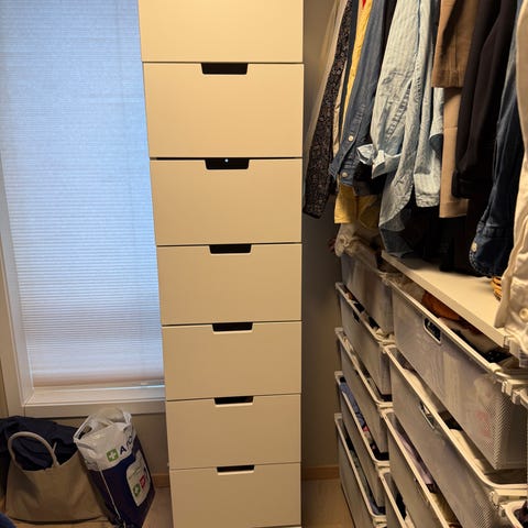ALEX Skuffeseksjon, malt hvit selv. Bruksmerker og en skuffe som er stri pga noe trøbbel med skinnene. Selges som den er.