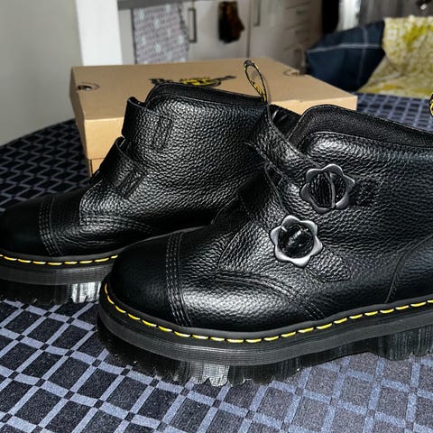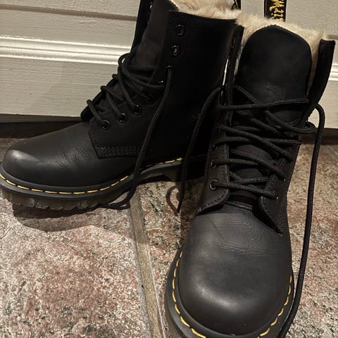 Dr. Martens vinterstøvler i størrelse 38. Støvlene er i svart skinn med snøring foran og karakteristisk gul søm rundt sålen. Innvendig er de foret med lys, myk fôr som gir ekstra varme. Grovmønstret yttersåle i gummi gir godt grep på underlaget. Egner seg som varme og robuste vintersko til hverdagsbruk.