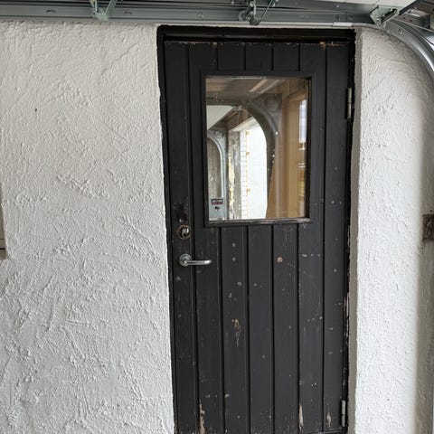 Ytterdør med vindu i øvre del. Døren er hvit og har stående panel på utsiden. Utstyrt med dørhåndtak og lås. Egnet som inngangsdør til bod, garasje eller lignende.