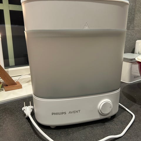 Philips Avent flaske- og tilbehørssterilisator i hvit utførelse. Enheten er beregnet for sterilisering av tåteflasker, smokker og annet babytilbehør.
