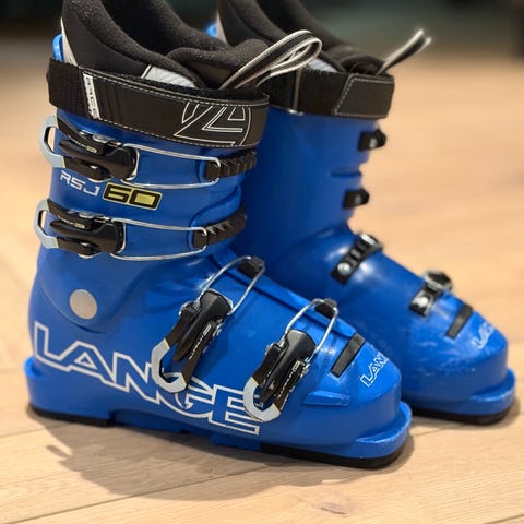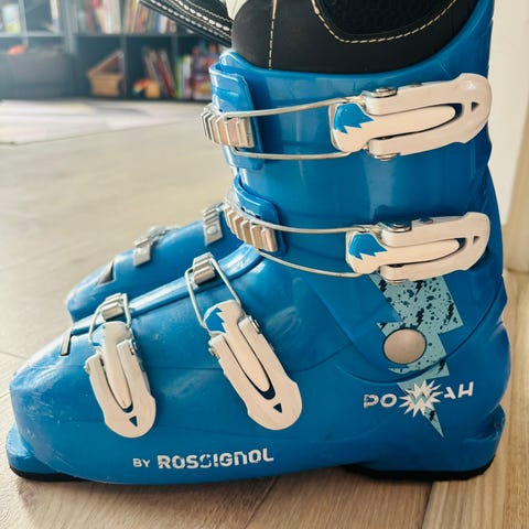Rossignol Poxah alpinstøvler for barn i størrelse 245 (ca. 285 mm sålelengde og str 38). Støvlene er blå med hvite spenner og svart innerstøvel. Modellen har fire justerbare spenner for tilpasning rundt fot og legg. Sålen har gummipartier for bedre grep ved gange. Egnet til alpint bruk for barn som trenger en støvel i denne størrelsen.