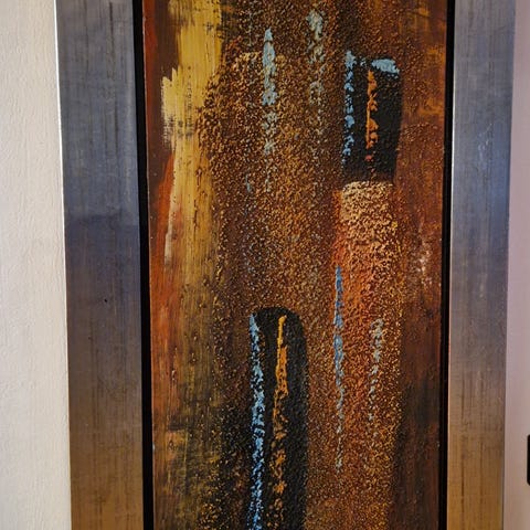 Selger et stilig abstrakt maleri (Olje på lerret, spent på blindramme) i sort, grå og gulltoner. Maleriet har et moderne og minimalistisk uttrykk som passer godt i stue, gang eller kontor. De strukturerte detaljene og fargespillet gir liv til rommet uten å bli for dominerende.