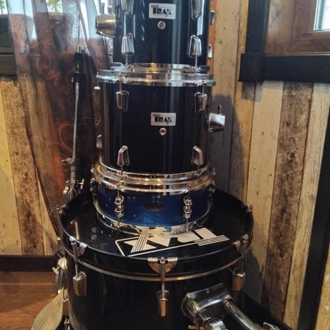 Settet består av basstromme, skarptromme, tammer og gulvtam, samt cymbaler montert på stativer. Det følger med pedal til basstromme og trommestikker som vist på bildene.