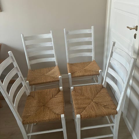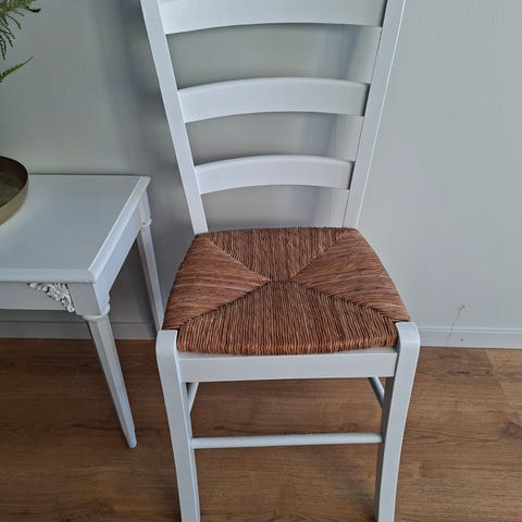 Søkeord: Stol trestol med flett flettet sete rotting kjøkkenstol spisestol spisestuestol trehvit hvitt hvitmalt jærstoler trestoler