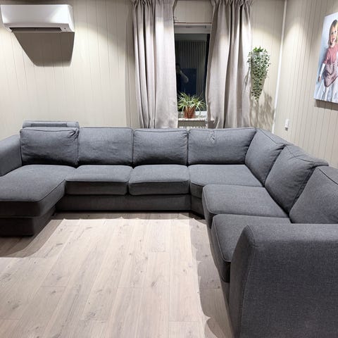 Stor hjørnesofa med cosy corner fra Skeidar selges. Sofaen er i en gråblå farge. Trekket er solbleket enkelte steder.