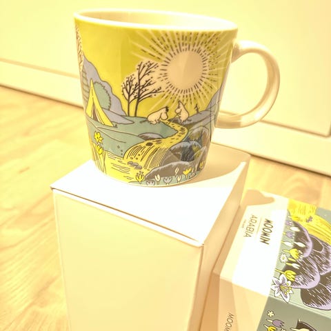 Arabia Moomin miniatyrkopp sett består av 6 små kopper i porselen med ulike Mummitroll-motiver i flere farger. Hver kopp har hank og påsatt bånd, slik at de kan brukes som dekor, samleobjekter eller oppheng. Settet leveres i original eske merket «Moomin miniatyr mug set 6 pcs». Koppene er laget i porselen og har trykte figurer fra Mummiuniverset på utsiden.