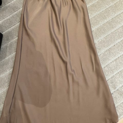 Nydelig satengskjørt i en dyp brun tone. Mykt og behagelig stoff som gir et eksklusivt uttrykk, samtidig som det er enkelt å style – like fint til boots og strikk som til hæler og en enkel topp. Klassisk midi-lengde som gjør det anvendelig både til hverdag og fest. Pent brukt.