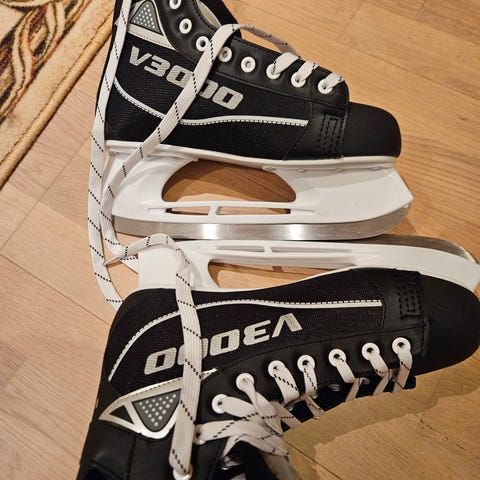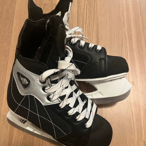 Canada 730 hockey størrelse 45. Ishockeyskøyter i svart og sølv farge med snøring og hvit skøytestål. Modellen er beregnet for ishockey, men kan også brukes til generell skøytebruk på isbaner. Overdelen er polstret for støtte rundt ankel, og skøytene leveres i original eske slik den vises på bildene.