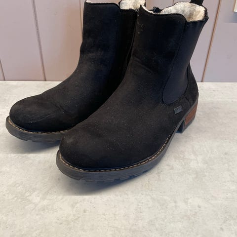 Rieker vinterstøvler i størrelse 38. Modellen er en ankelhøy vinterstøvel med snøring. Fargeinntrykket er mørkt/svart med kontrastsømmer og tekstilkant øverst på skaftet. Støvlene har mykt, lyst fôr på innsiden som gir ekstra isolasjon. Yttersålen er mønstret gummi for bedre grep på glatt underlag. Egnet som varme og praktiske vinterstøvler til dame i hverdagsbruk.