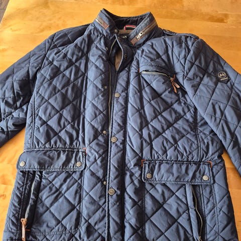 Jean Paul vinterjakke for herre i størrelse XL. Jakken er mørkeblå og laget i polyester. Modellen har hette og lengre passform som dekker godt nedover hoftene. Foran er det lommer med klaff og skjult glidelås- og knappelukking.